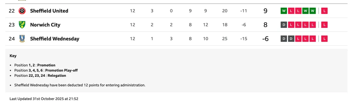Diving into the long history of English soccer clubs is fascinating, as many clubs pre-date entire American sporting leagues. Sheffield Wednesday, which dates from 1867, has effectively gone into bankruptcy and were docked 12 points in the EFL Championship (second-highest tier in English soccer) standings. It's not often you get to see a team earn negative points in their season, but the chart doesn't lie. Here's what you'd see on BBC Sport as of October 31: